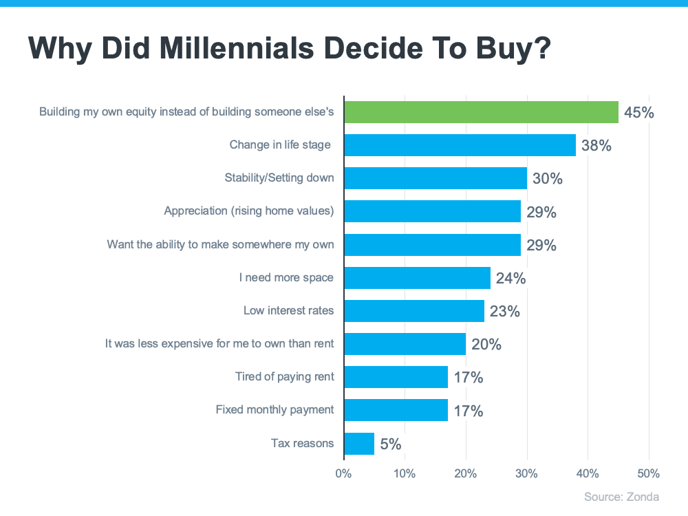 This graph shows why millennials are buying homes according to Zonda’s 6th annual millennial survey. The top reasons include building equity, a change in life stage, wanting stability, rising home values, and wanting to make somewhere truly their own. Here’s a look at each in more detail.